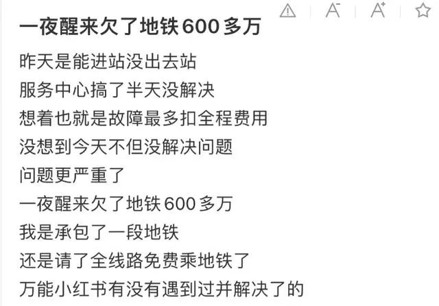 但隨后想起前一天的情況后,該網(wǎng)友也是意識(shí)到了問(wèn)題,這是地鐵的收費(fèi)的系統(tǒng)出現(xiàn)了問(wèn)題。此前新聞也爆出過(guò)此類問(wèn)題,刷公交,地鐵等不斷扣費(fèi)的情況。于是不再慌張,并把情況發(fā)到了小紅書之上尋求幫助。而自己也前往地鐵部門進(jìn)行協(xié)商。