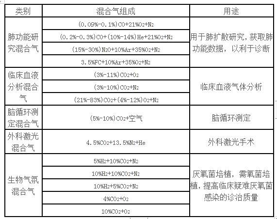 臨床醫(yī)學、衛(wèi)生防疫、醫(yī)療和生物研究等領域需用的混合氣體,主要品種有:肺功能研究混合氣、臨床血液氣體分析用混合氣、腦循環(huán)測定混合氣、外科激光混合氣、生物氣氛混合氣以及組織當量混合氣等。